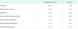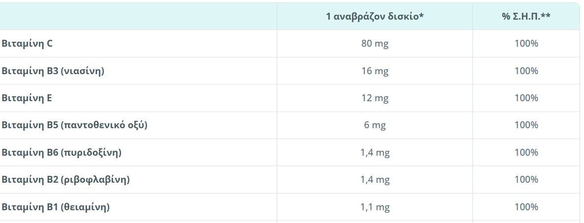 - με την ημερήσια δόση (1 αναβράζον δισκίο) εξασφαλίζετε το 100% της συνιστώμενης ημερήσιας πρόσληψης βιταμινών C, E, B1, B2, B3, B5, B6 και B12.