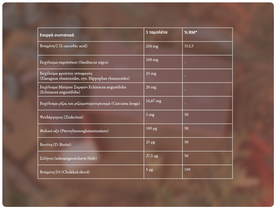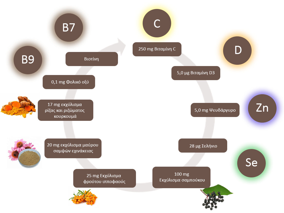 Πρόκειται για ένα σύνθετο συμπλήρωμα διατροφής, πιο συγκεκριμένα δισκίο δύο στρώσεων, που περιέχει βιταμίνες C και D, ψευδάργυρο, σελήνιο και φυτικές ίνες. Αυτά χρησιμεύουν για τη διατήρηση της φυσιολογικής λειτουργίας του ανοσοποιητικού συστήματος, τόσο όλο το χρόνο ως μέρος της πρόληψης όσο και σε εκτεθειμένες εποχές, όπως το φθινόπωρο και ο χειμώνας.